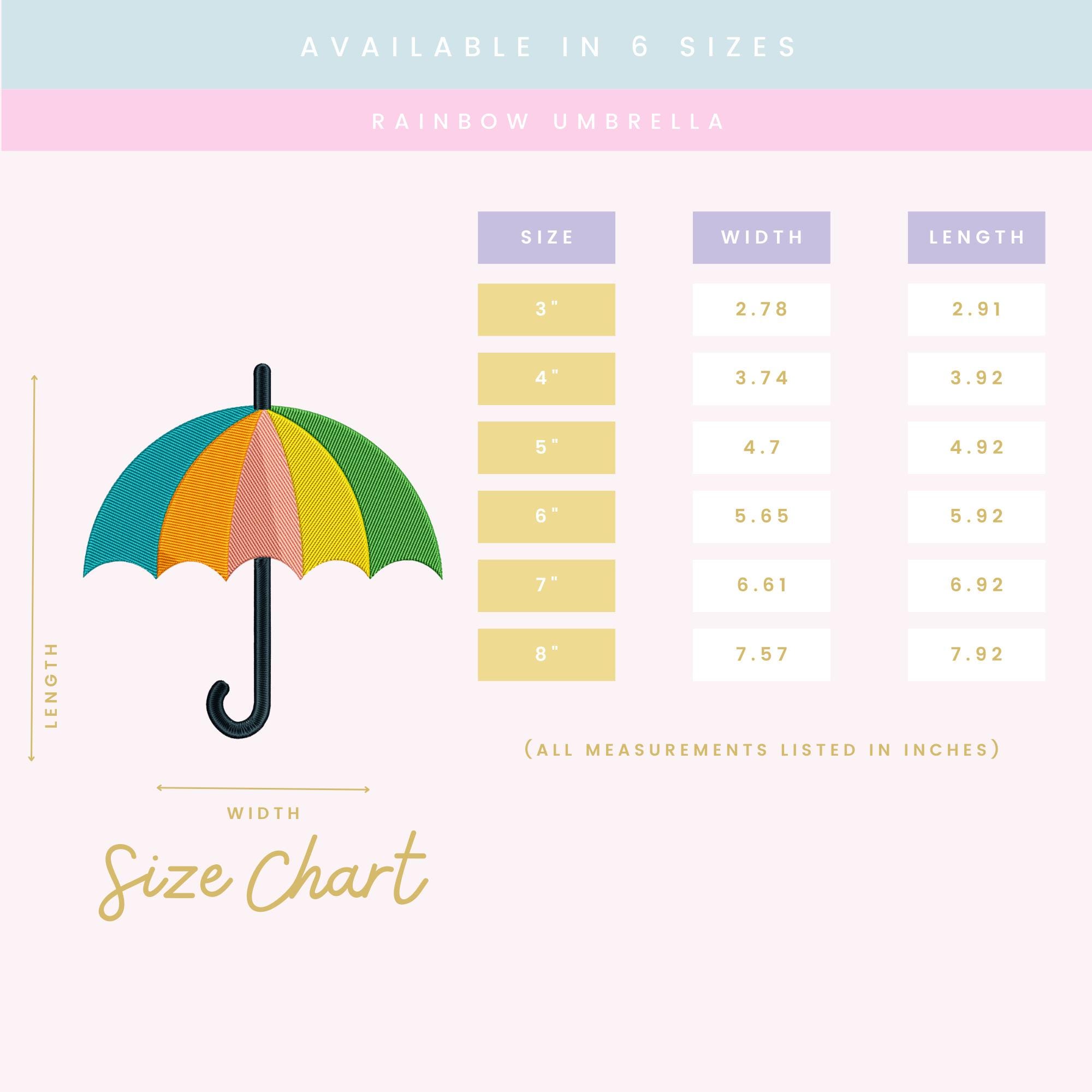 A ZIP file containing 6 sizes of the Rainbow Umbrella design: