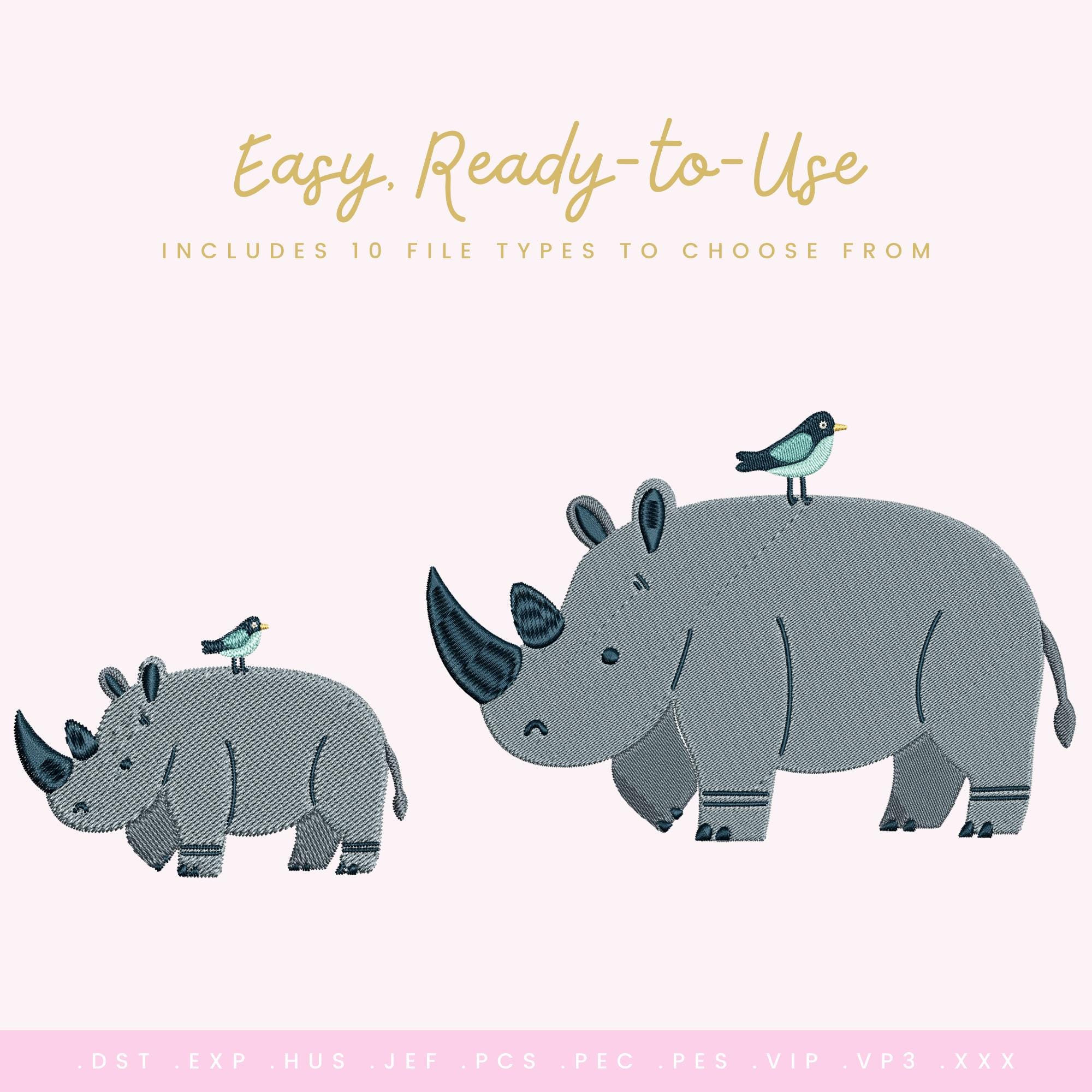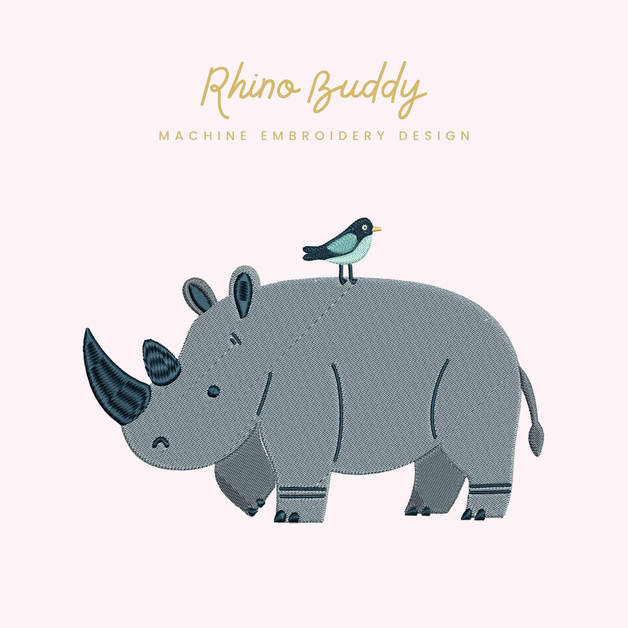 Rhino Buddy – Machine Embroidery Design (Instant Download!) Add a gentle, playful touch to your embroidery projects with this charming Rhino Buddy design. Featuring a sweet rhinoceros with a tiny bird companion, this design has a calm, friendly feel that’s perfect for children’s clothing, nursery décor, bags, quilts, and thoughtful handmade gifts.