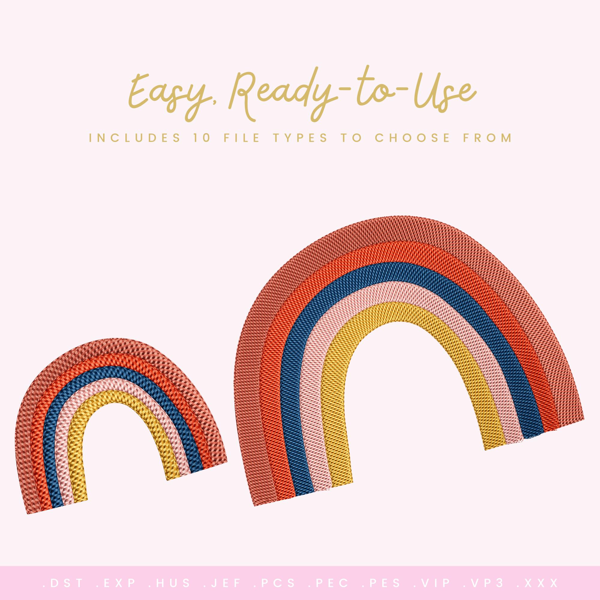 This updated version has been refined for smoother stitching, balanced density, and a clean, professional finish across all sizes. Designed to stitch reliably on all major embroidery machines, this rainbow offers a timeless look that works beautifully for both playful and minimalist designs.