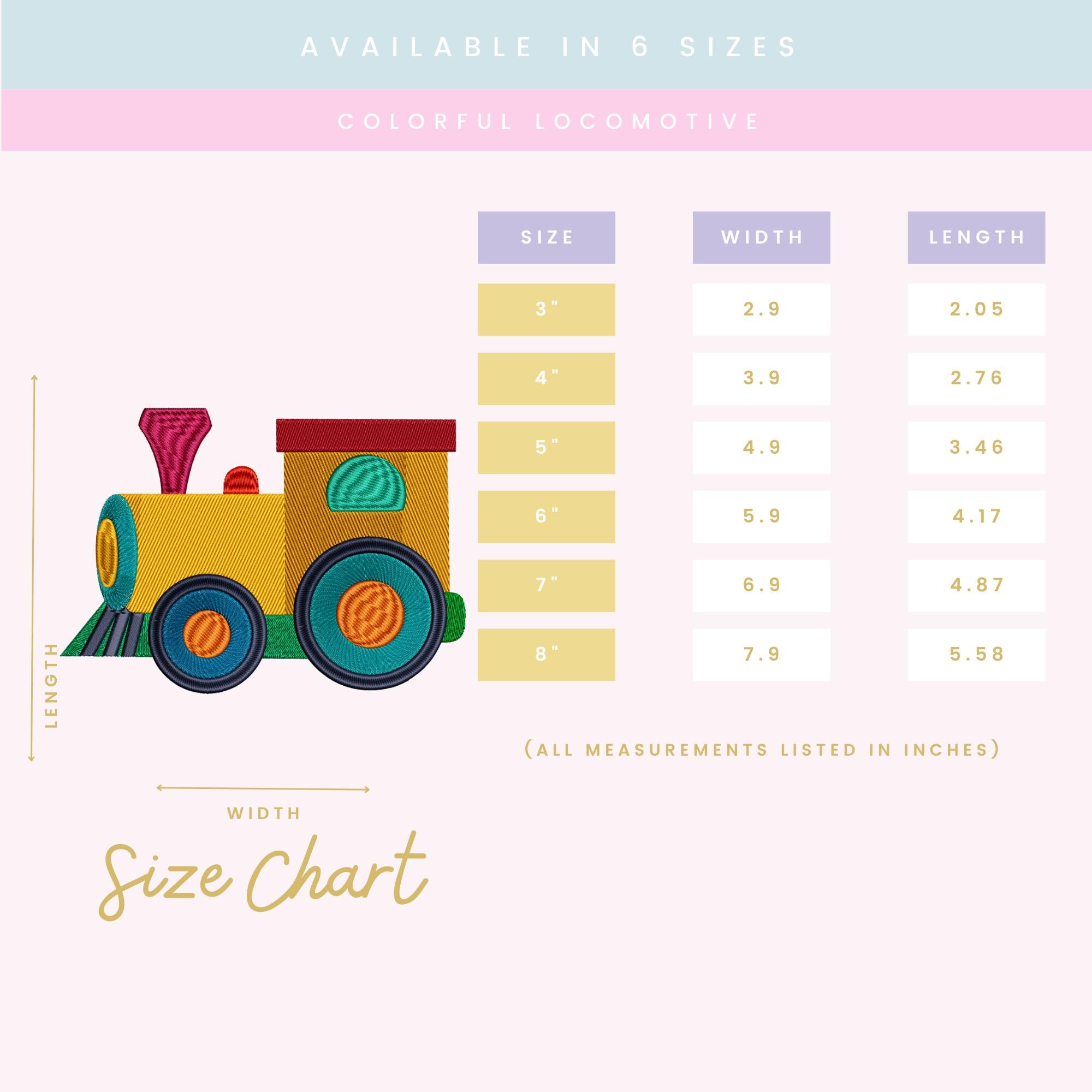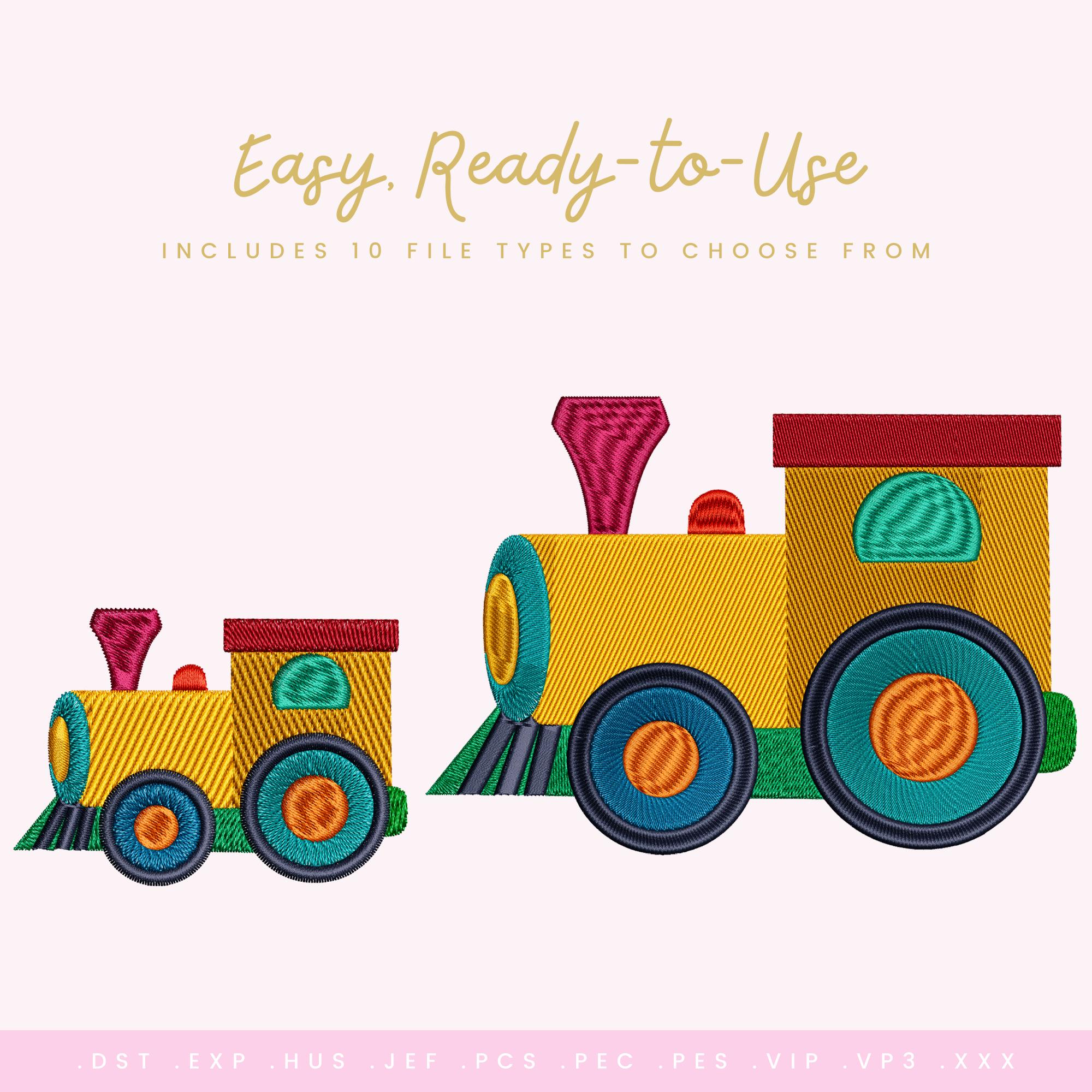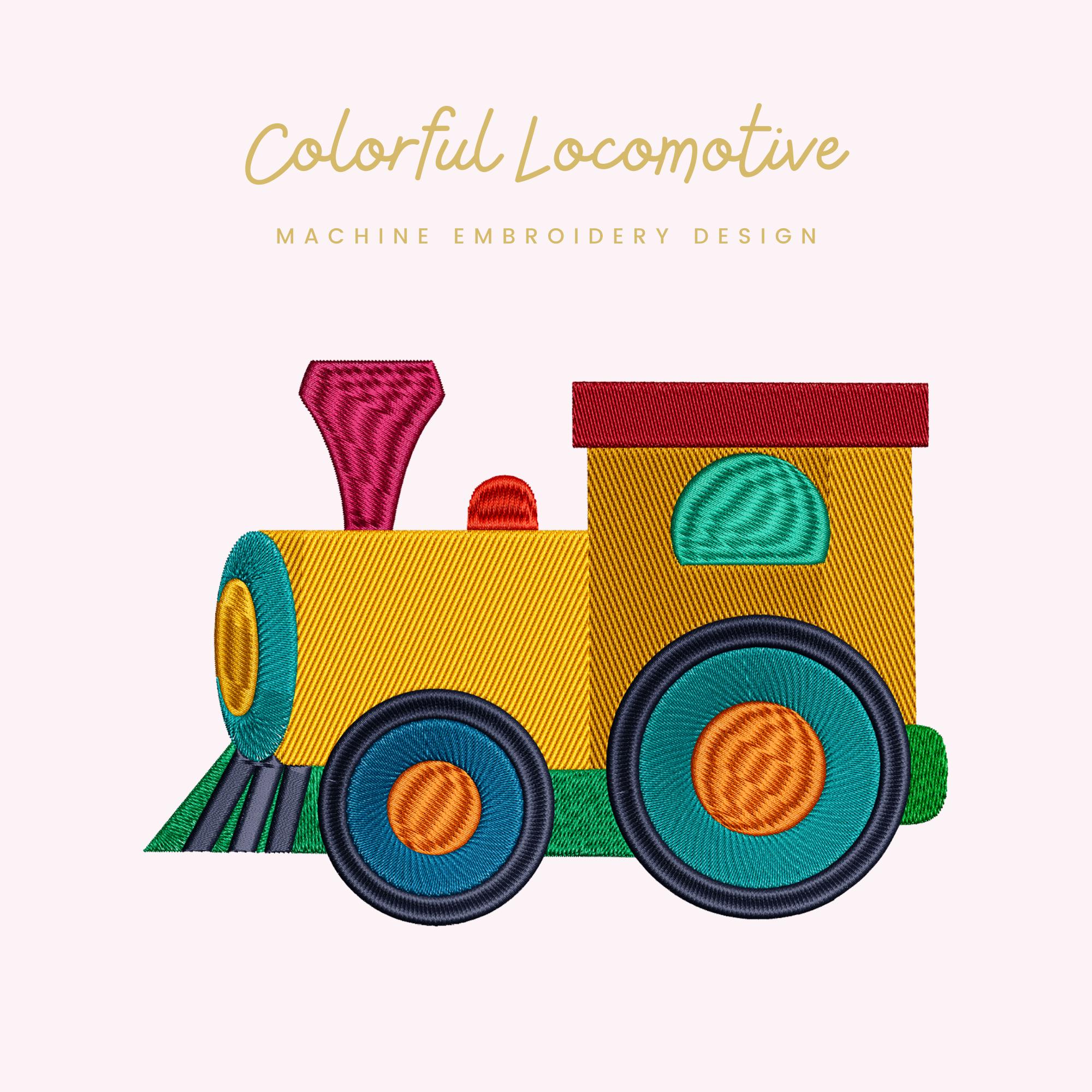 This listing reflects an updated version of the Colorful Locomotive design. The update includes improved stitch quality, expanded sizing, and refined density for smoother stitch-outs and more consistent results across modern embroidery machines.