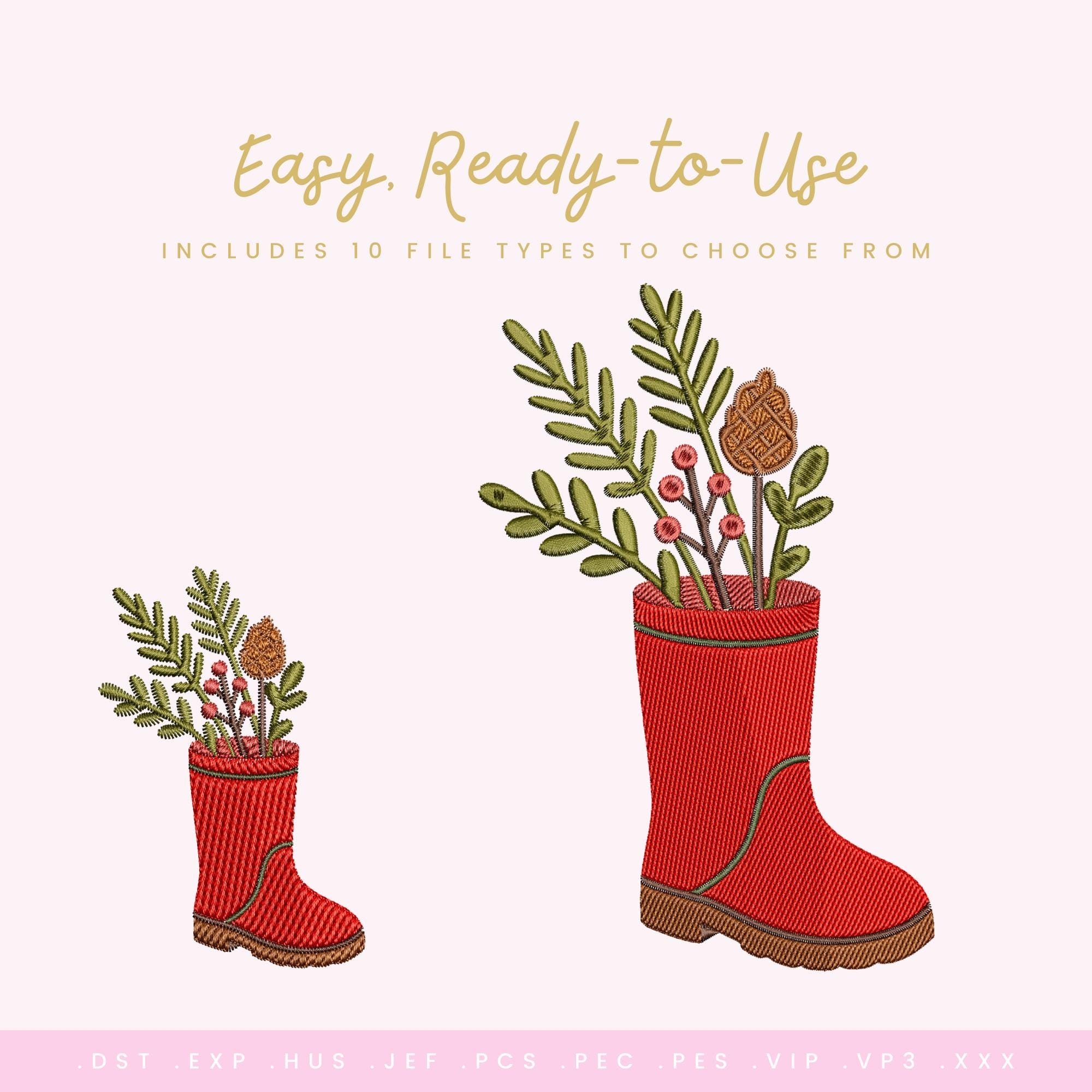 Evergreen Boot Bouquet – Machine Embroidery Design (6 Sizes Included!) Winter Floral Boot Stitch File • Holiday Embroidery • Instant Download