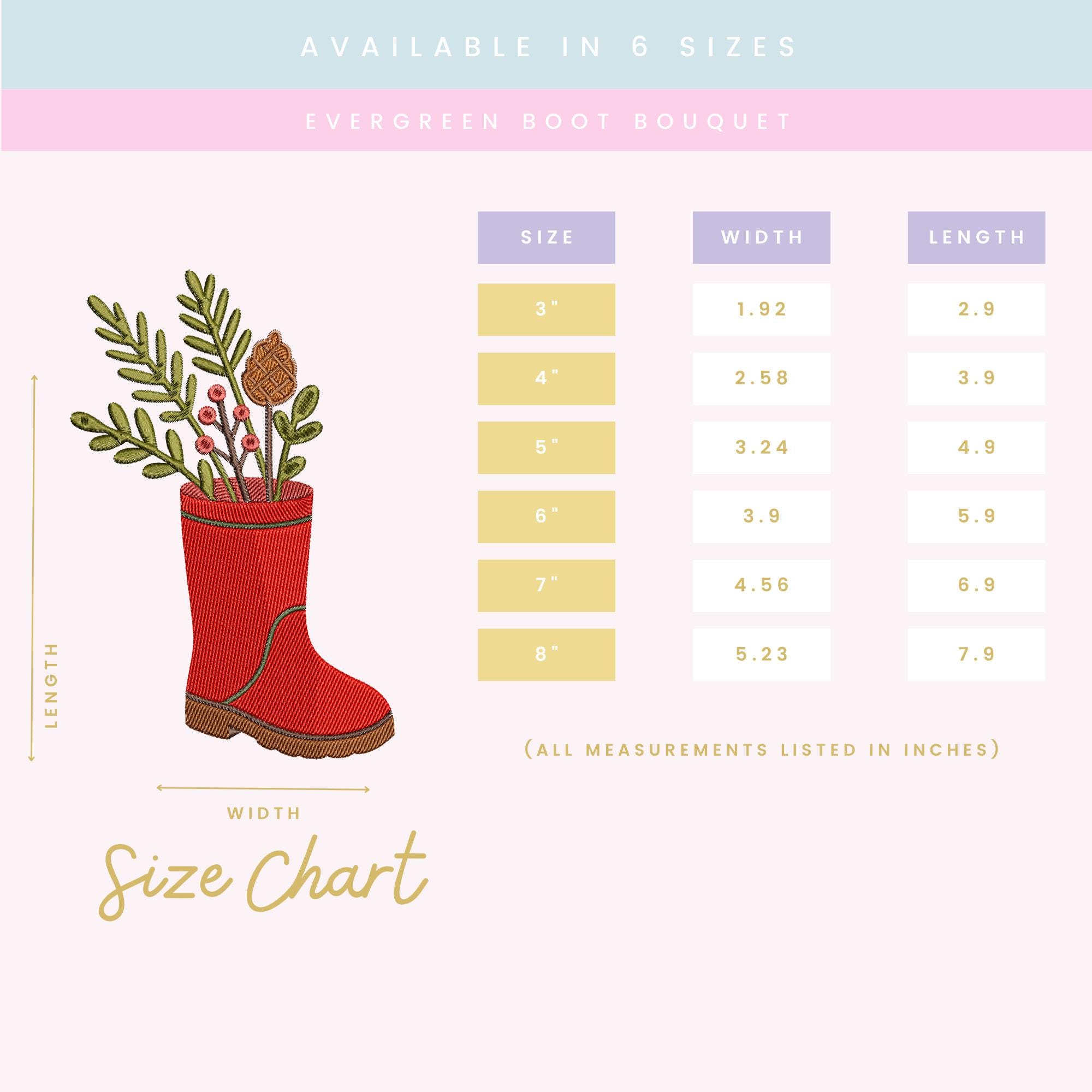 A ZIP file containing 6 sizes of the Evergreen Boot Bouquet design: