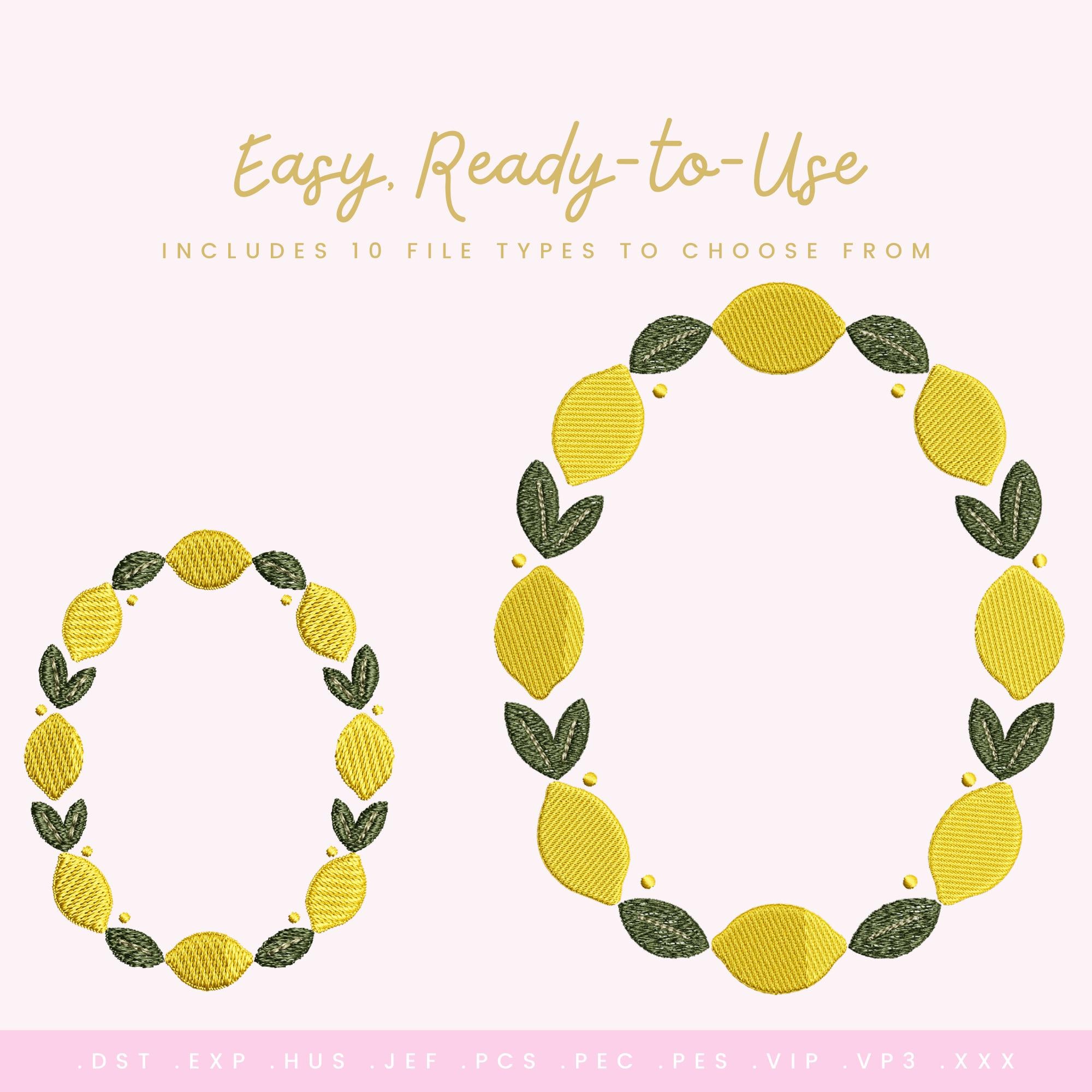 Add a bright, cheerful touch to your projects with this fresh Lemon Monogram Frame embroidery design. Featuring a clean circular wreath of golden lemons, leafy greenery, and small accent dots, this design is perfect for monograms, names, and initials on summer apparel, kitchen linens, gifts, and home décor. Created in my studio and digitized for smooth, balanced stitching on all major embroidery machines.