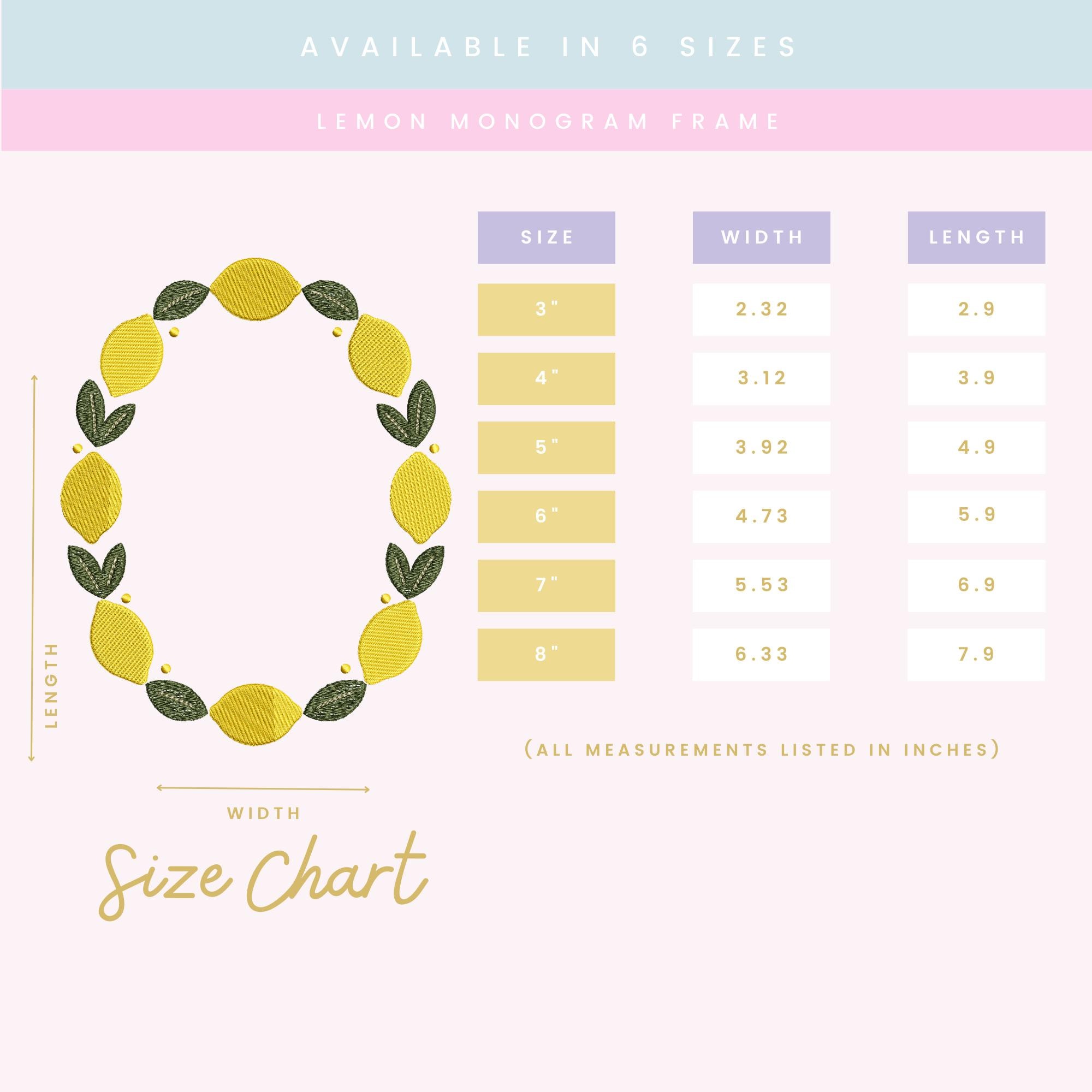 A ZIP file containing 6 sizes of the Lemon Monogram Frame design: