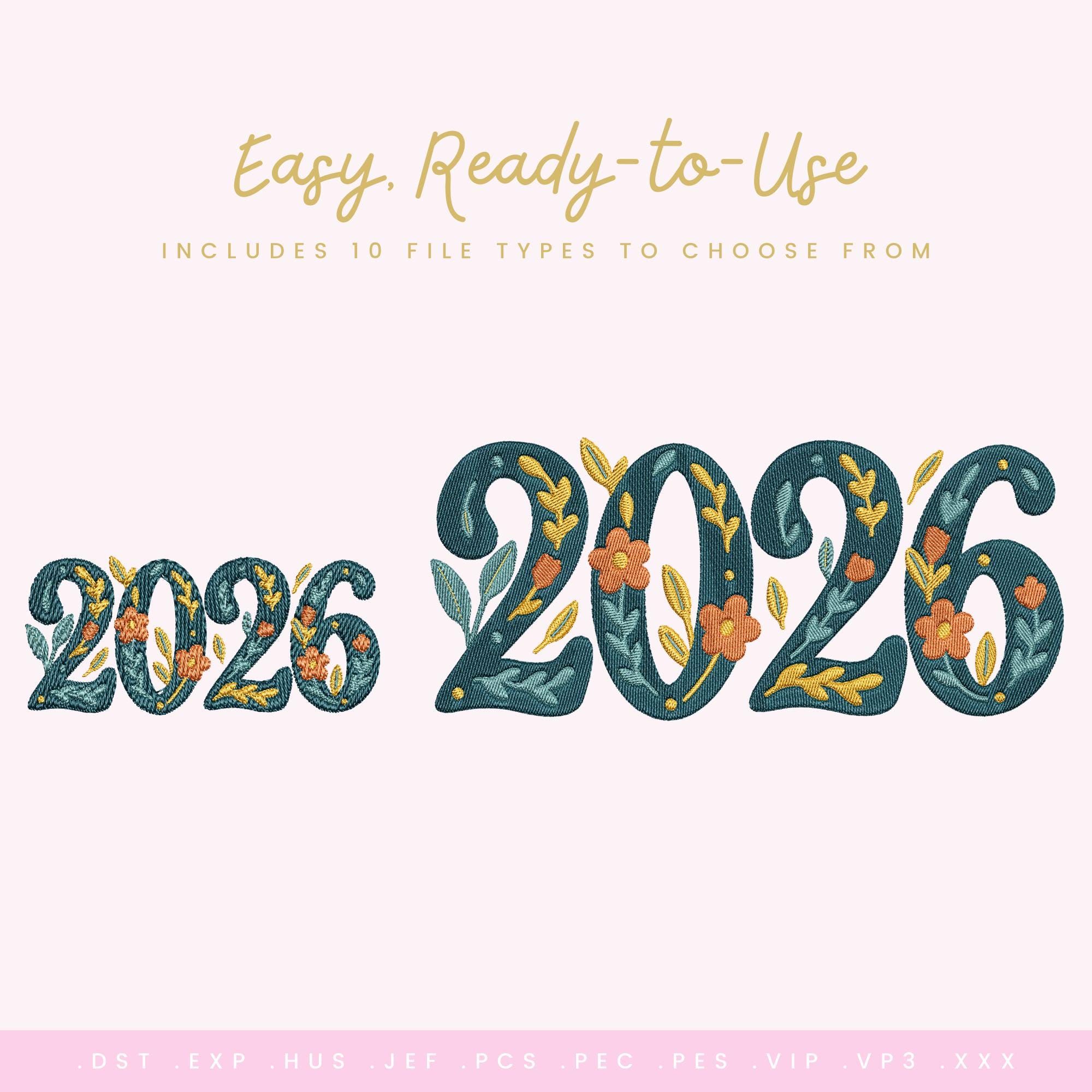 Celebrate the new year with timeless charm using this elegant Floral 2026 embroidery design. Featuring richly textured numbers filled with delicate florals, leafy accents, and a refined botanical palette, this design is perfect for keepsake projects, apparel, memory quilts, and heirloom-style décor. Carefully digitized for clean stitch-outs, it brings a polished, professional finish to any embroidery project.