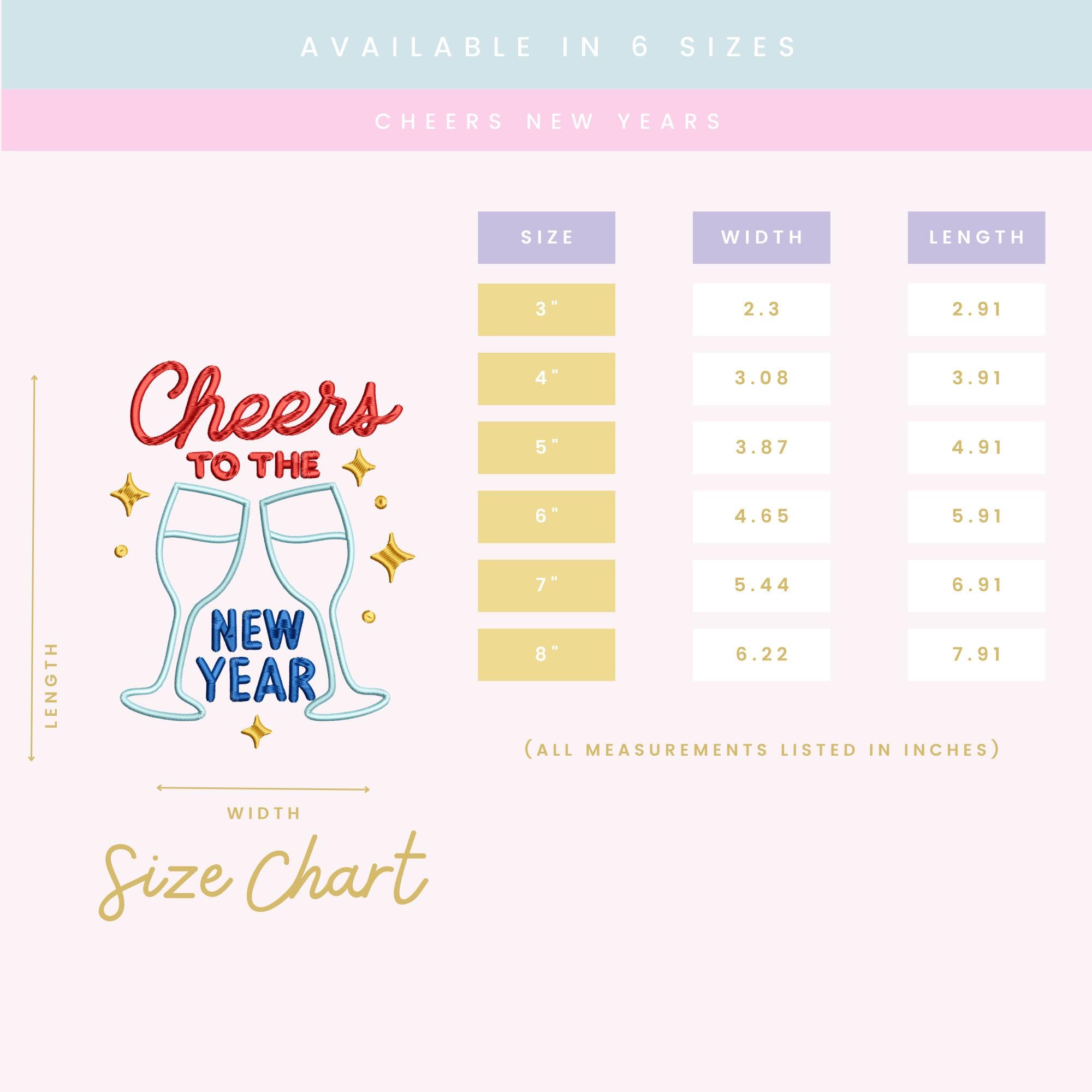 Celebrate the start of a fresh year with this festive Cheers New Years embroidery design! Featuring clinking champagne glasses, sparkling accents, and bold stitched lettering, this design is perfect for New Year’s outfits, party décor, keepsake gifts, and seasonal projects. Digitized for smooth, clean stitch-outs on all major embroidery machines.