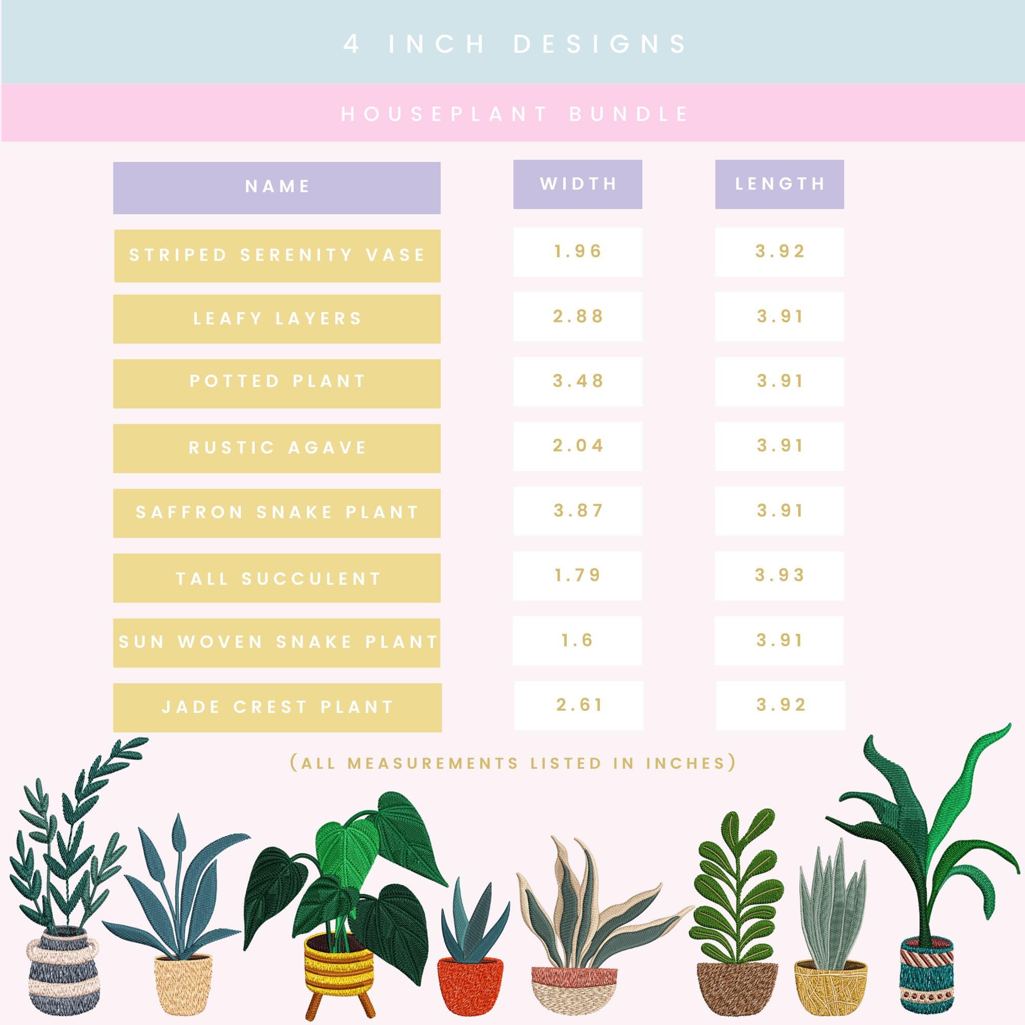 A ZIP file containing 8 individual houseplant embroidery designs, all sized for 4” hoops: