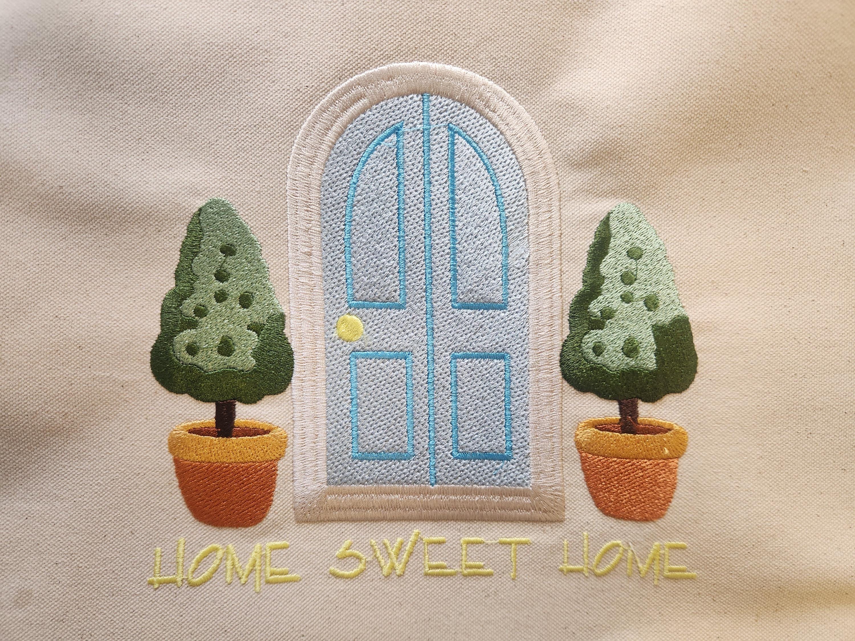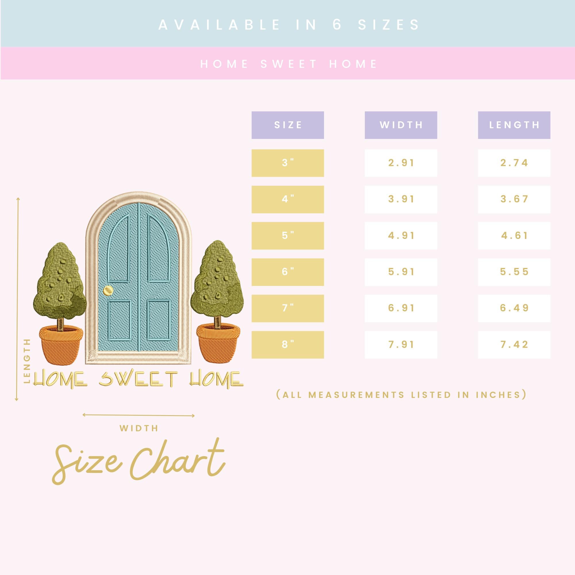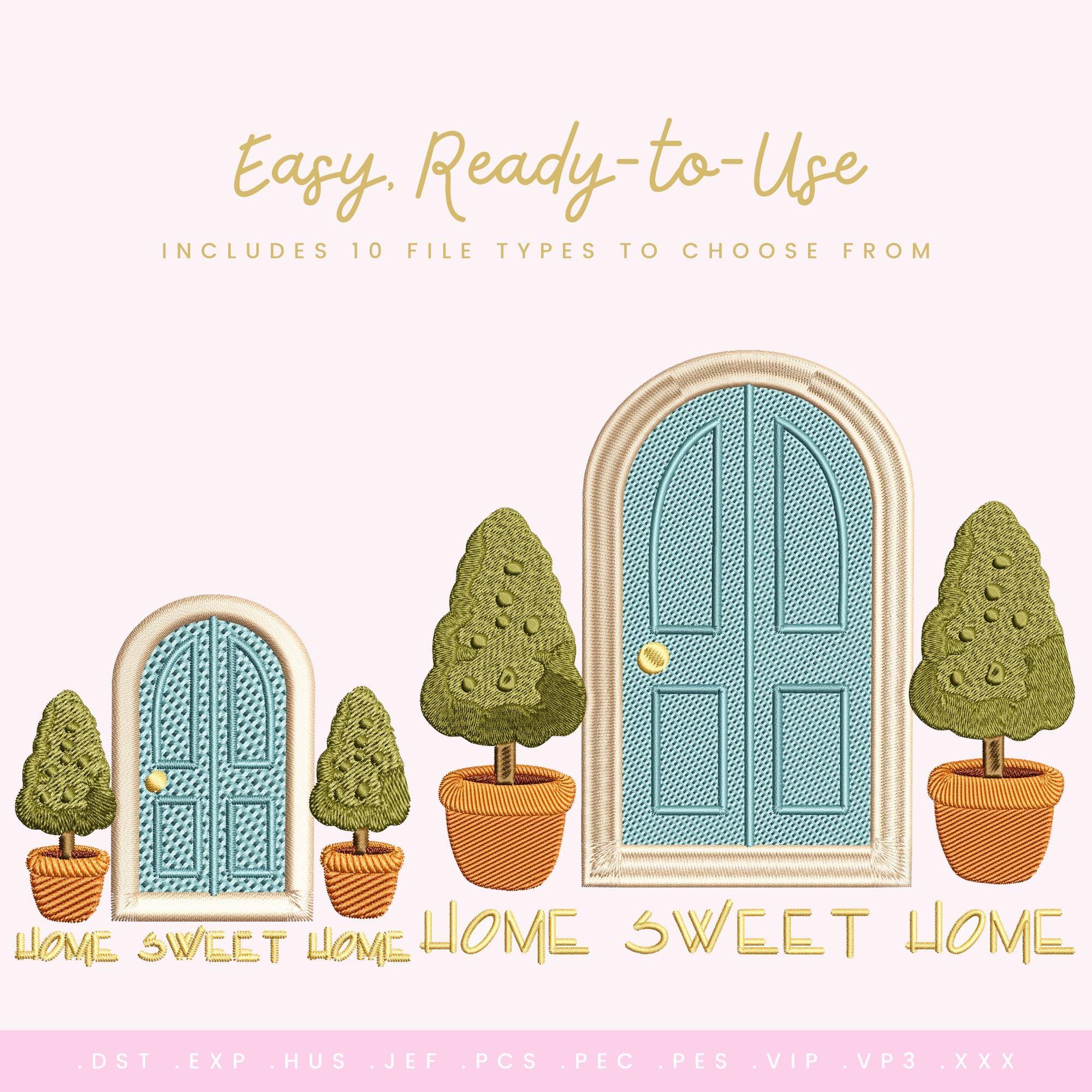 Add a cozy, welcoming touch to your embroidery projects with this charming “Home Sweet Home” design. Featuring an arched front door with potted topiary trees and stitched lettering, it’s perfect for towels, throw pillows, kitchen linens, wall hangings, tote bags, housewarming gifts, and sweet little entryway décor projects.