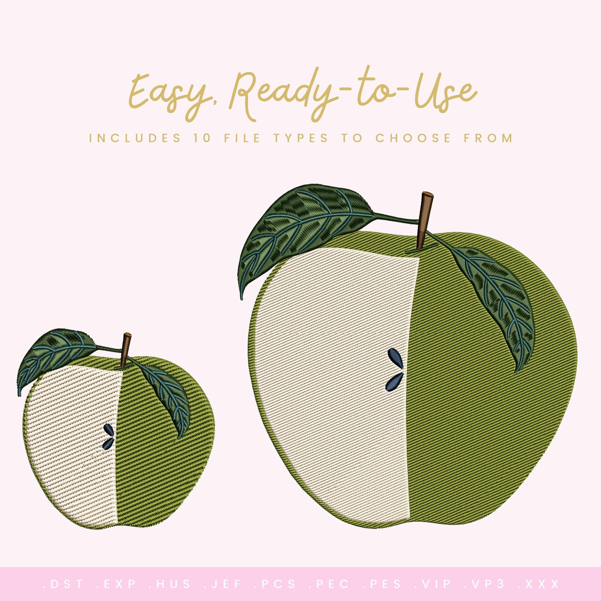 Fresh, crisp, and timeless — this Green Apple embroidery design adds a clean, modern fruit element to your stitching projects. Featuring a half-cut apple with visible seeds and detailed leaf stitching, this design blends bold shape with soft texture for a polished, professional finish.