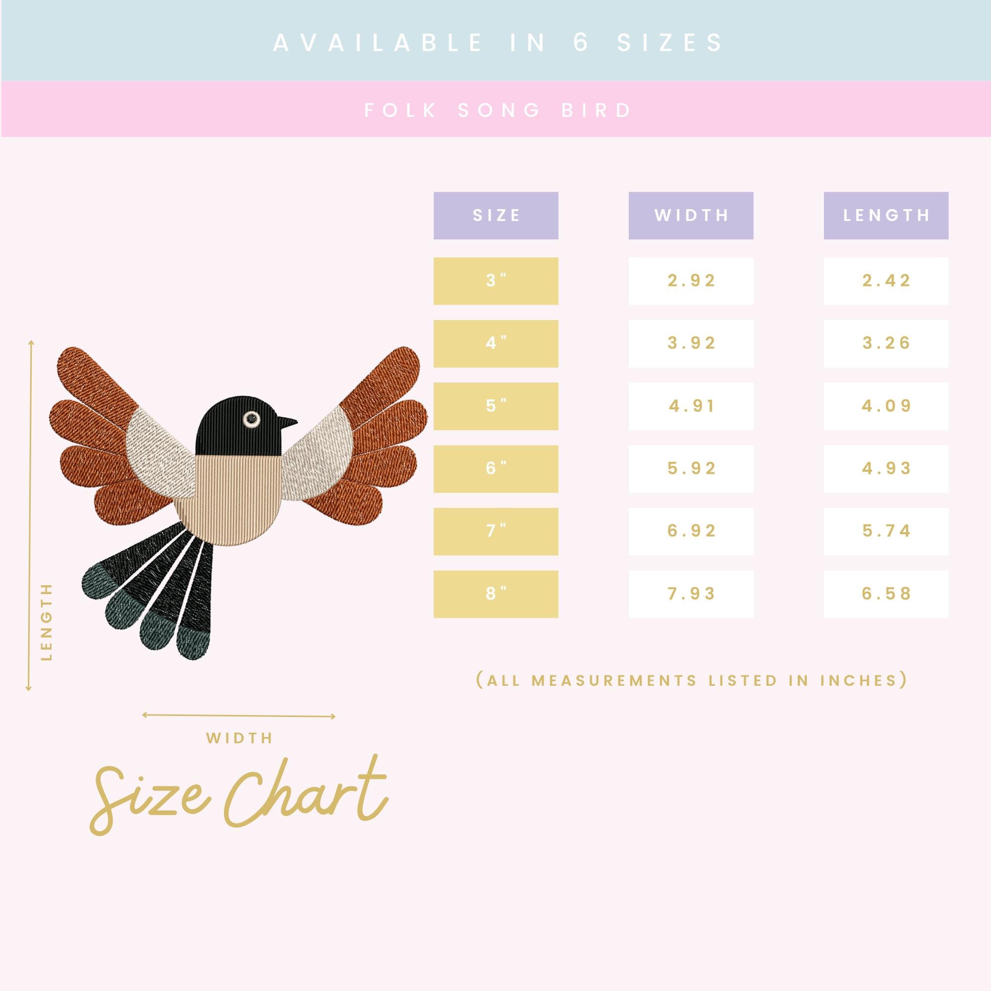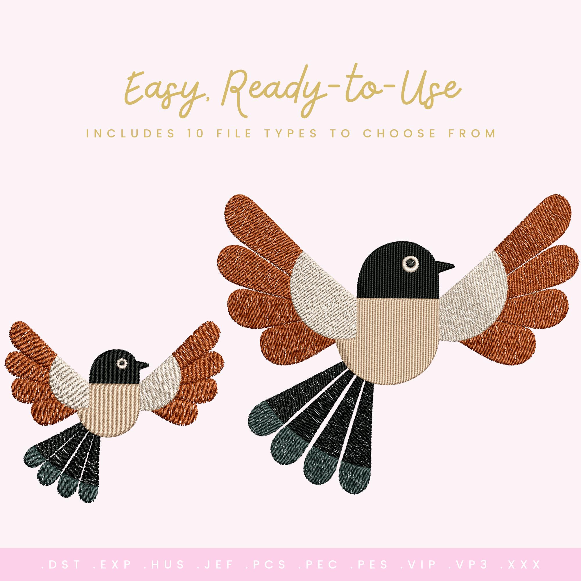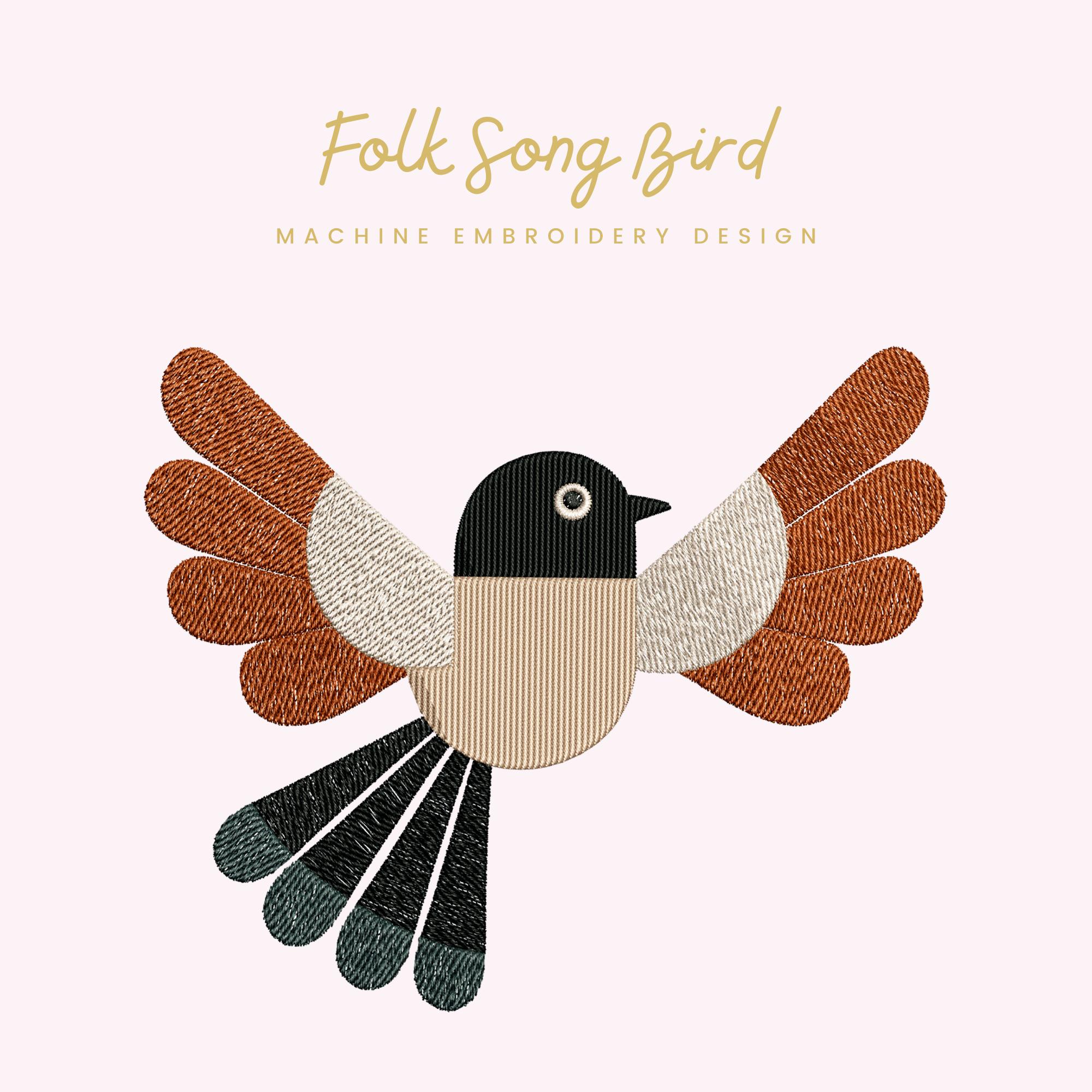 Bold, balanced, and full of modern folk charm — this Folk Song Bird embroidery design features layered wings, clean geometric sections, and detailed tail stitching for a polished, dimensional finish.