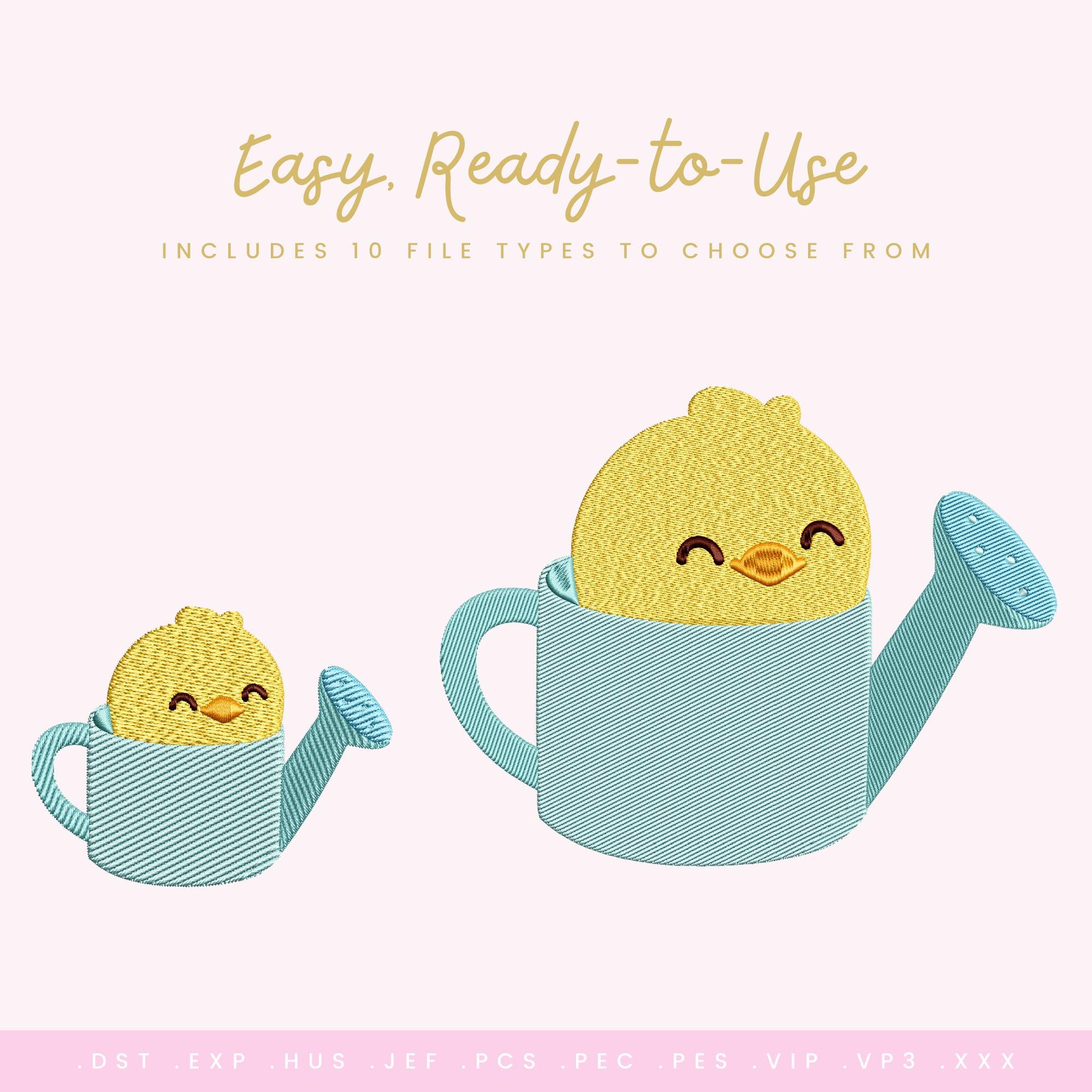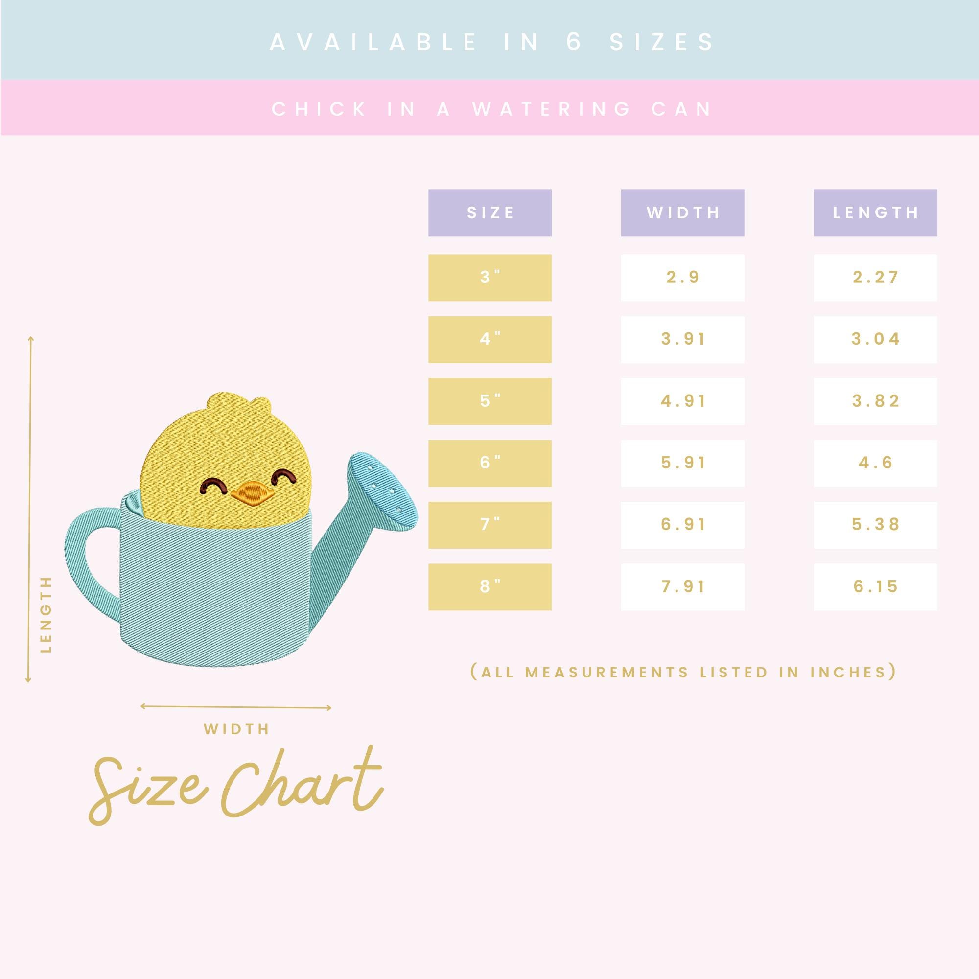 A ZIP file containing 6 sizes of the Chick in a Watering Can design: