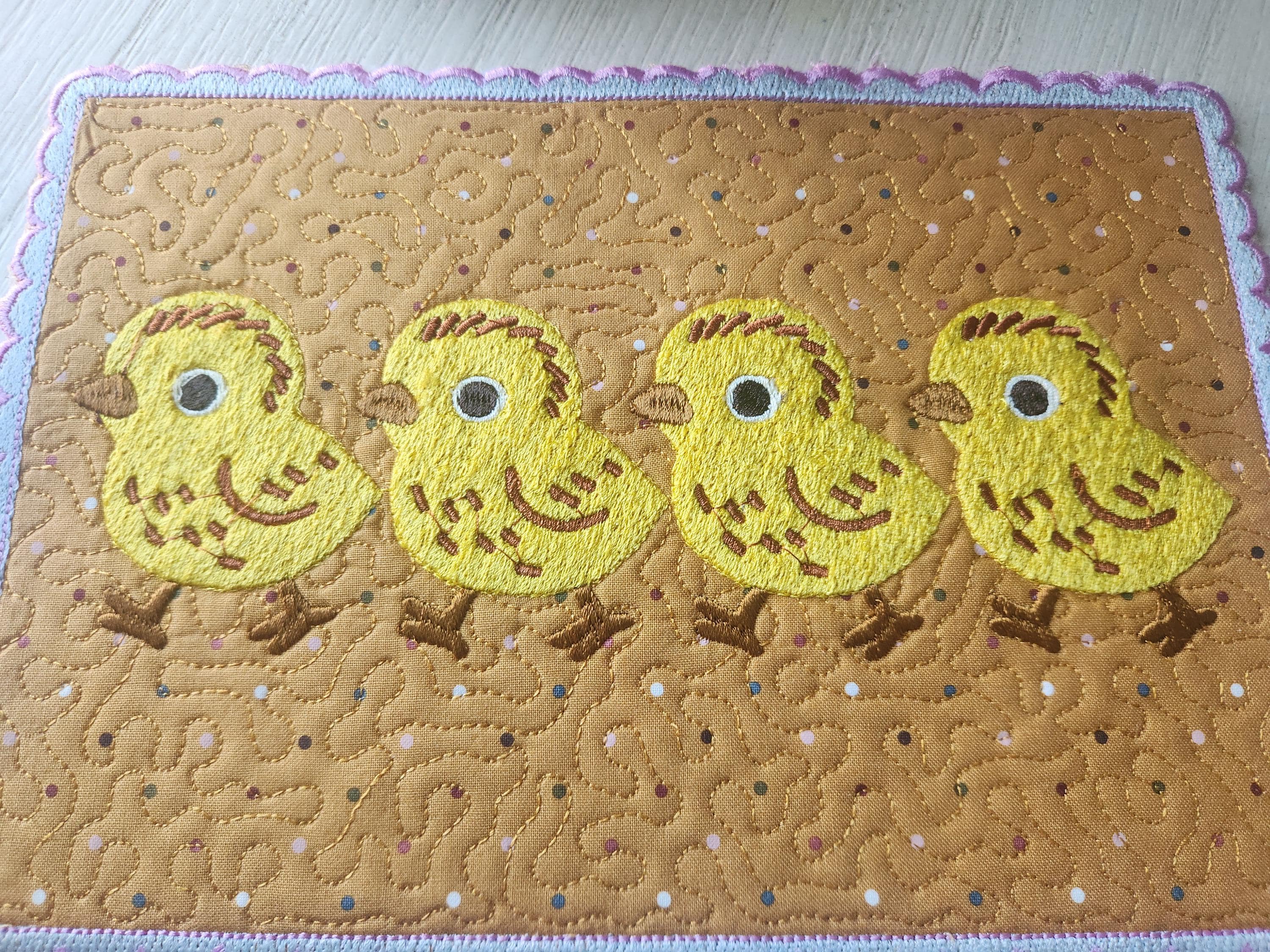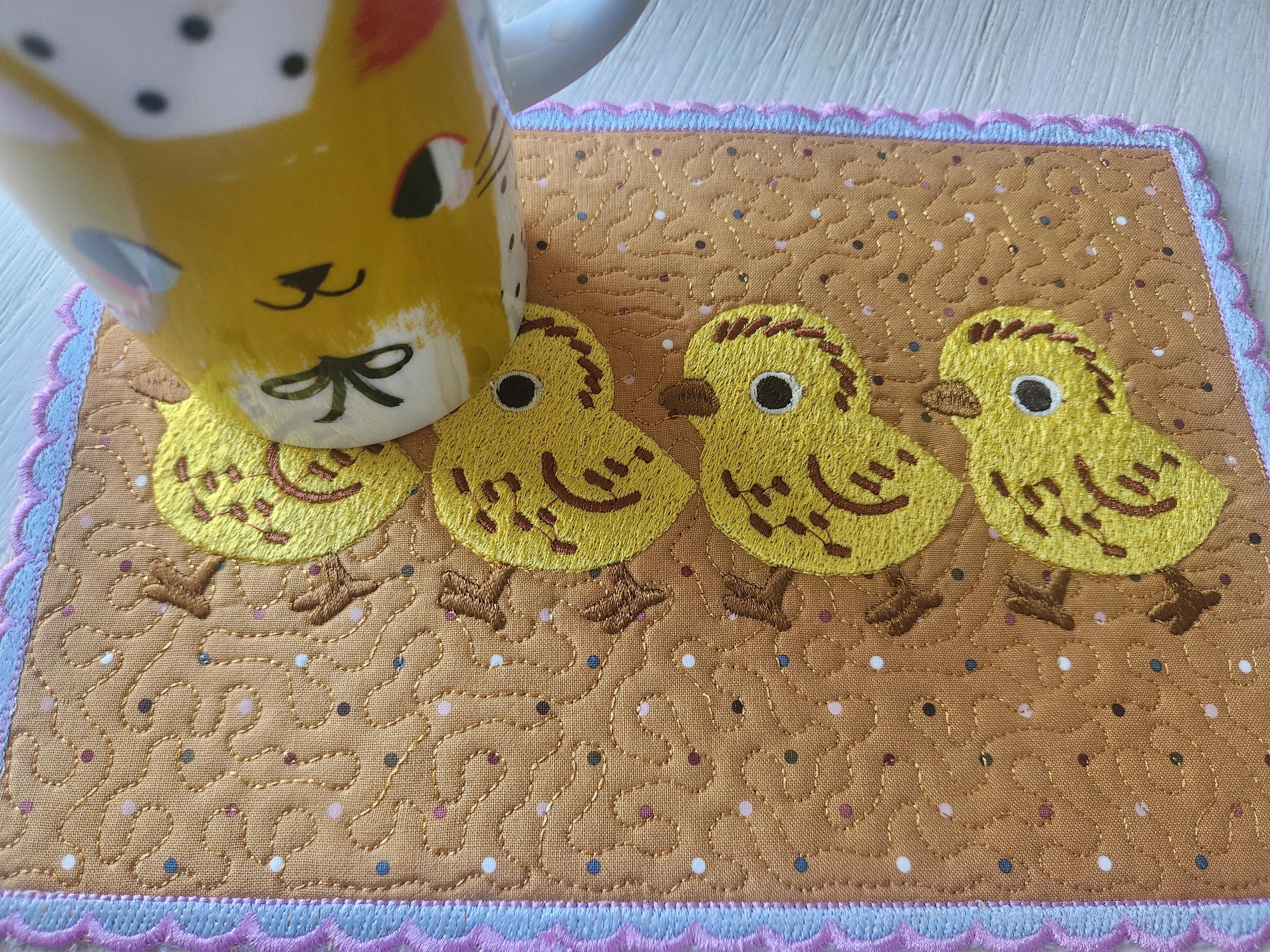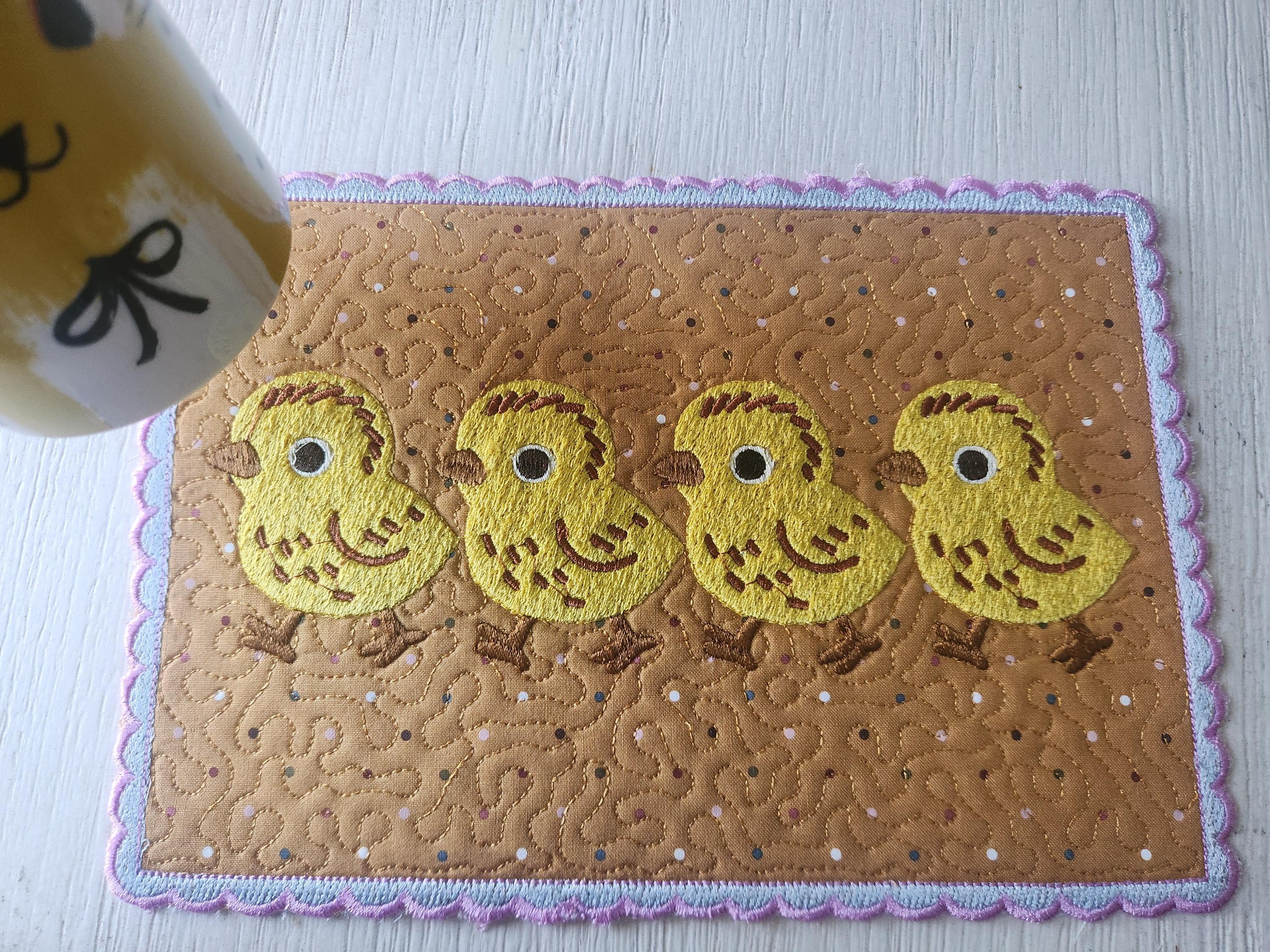 The repeating chick layout creates a fun decorative border that stitches beautifully across a variety of projects.