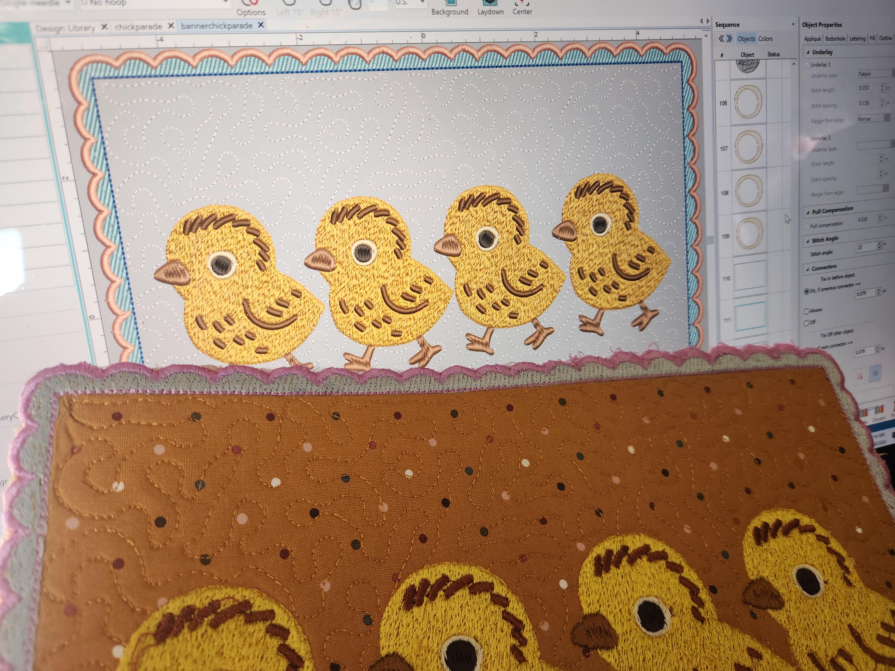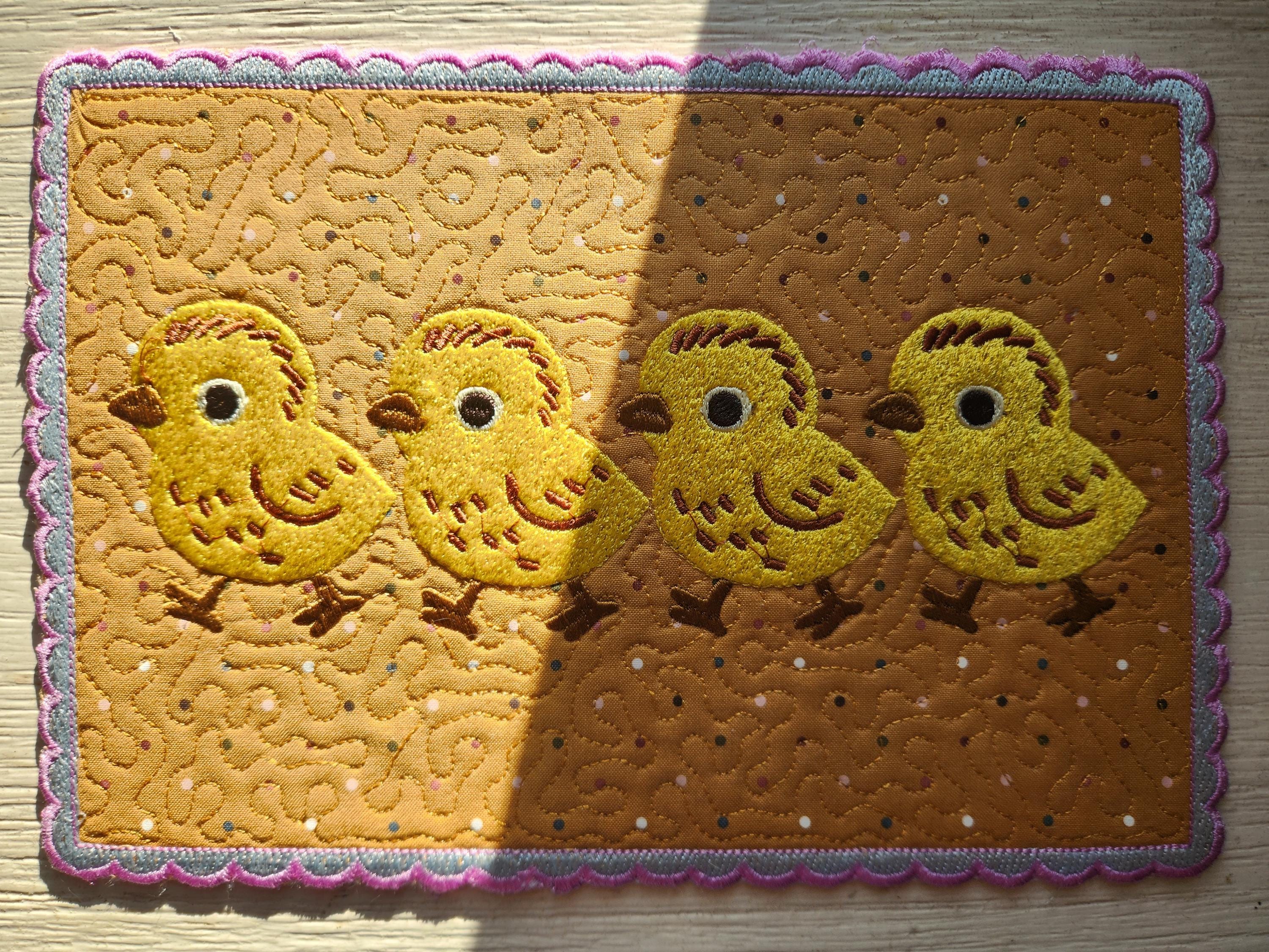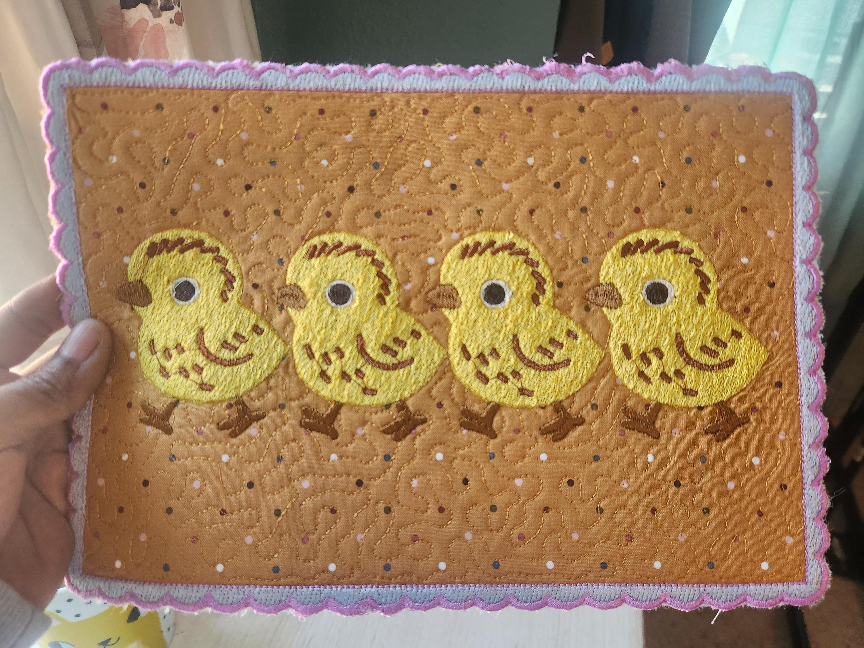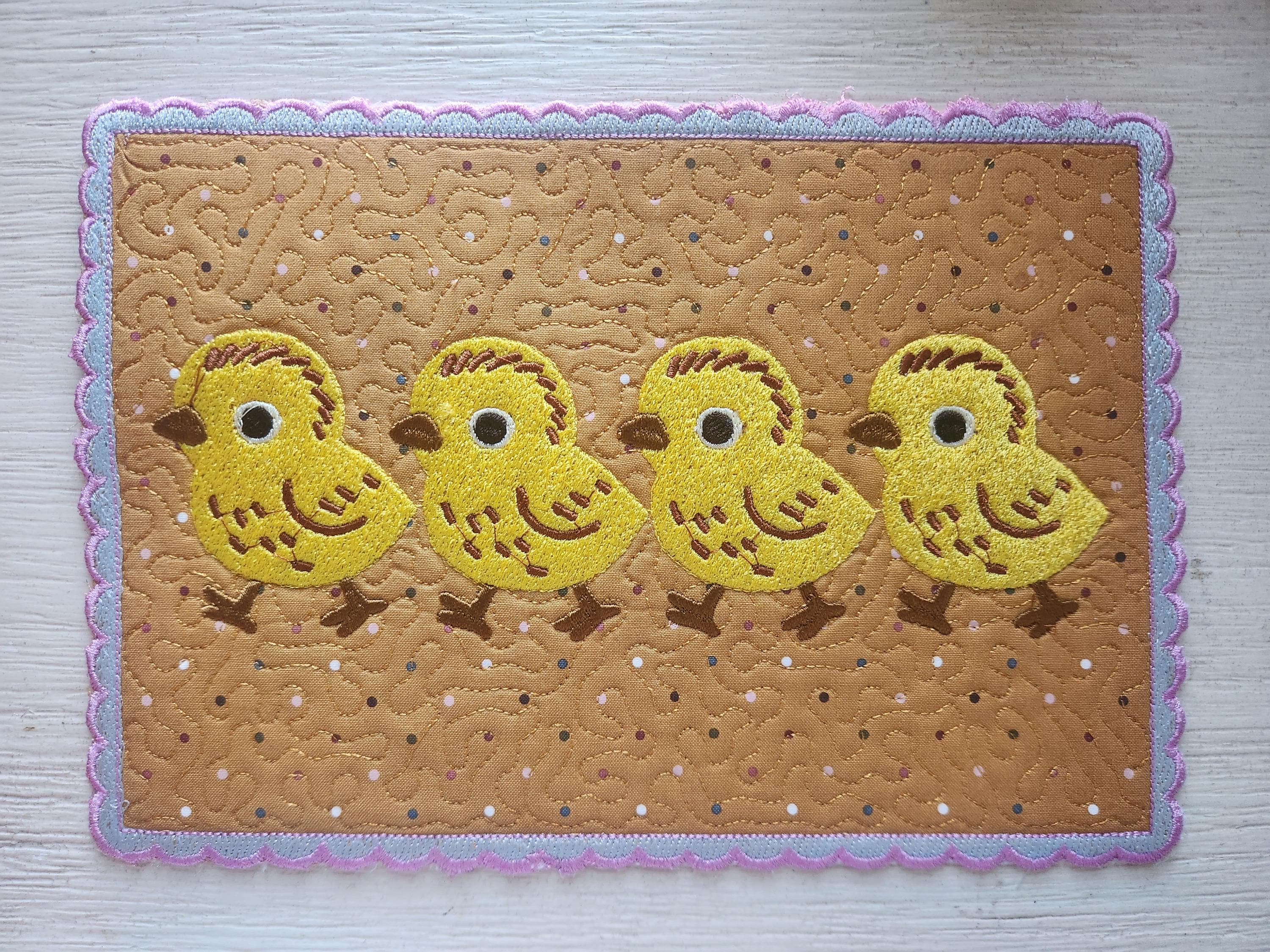 The repeating chick layout creates a fun decorative border that stitches beautifully across a variety of projects.