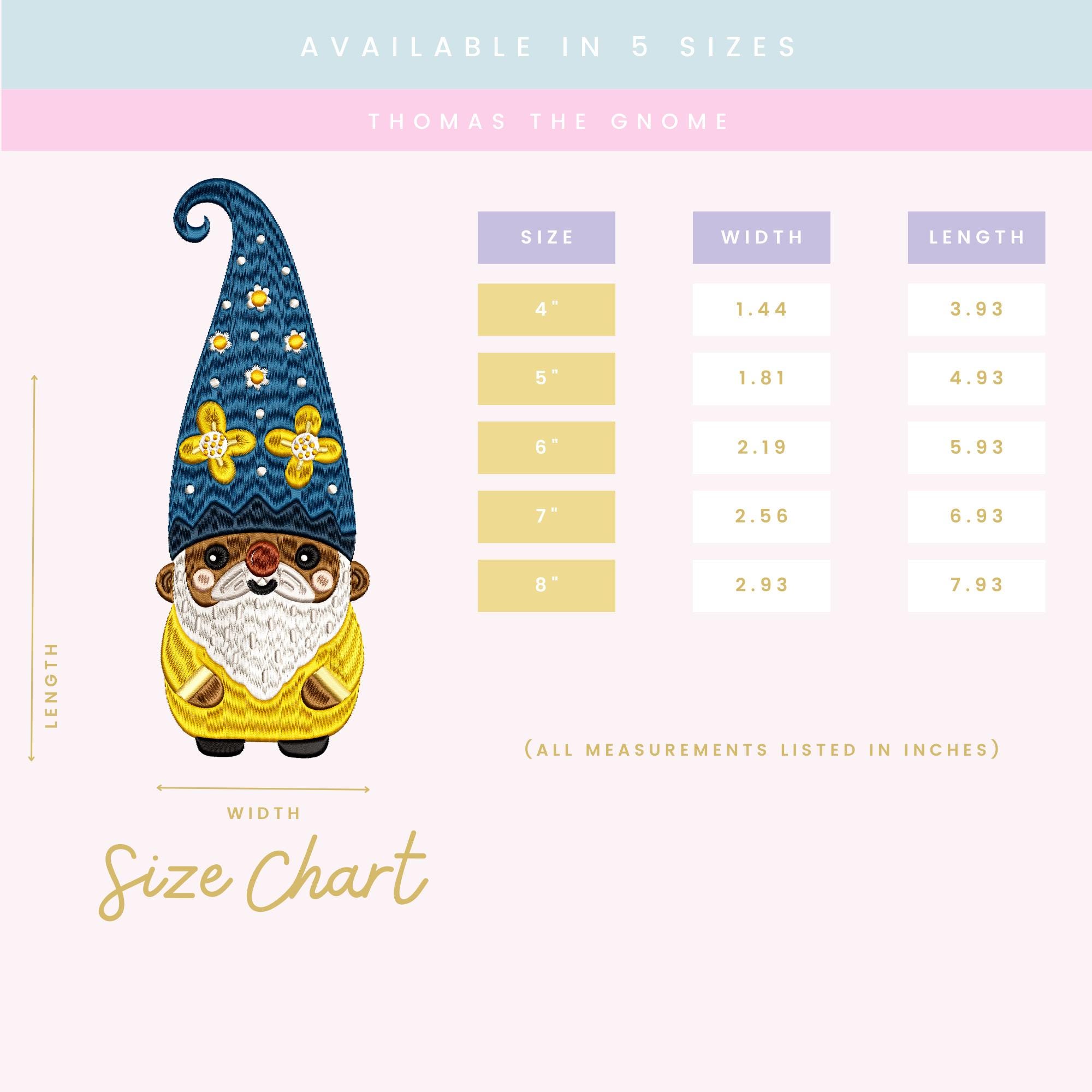 Add a charming woodland touch to your embroidery projects with Thomas the Gnome. Featuring a whimsical gnome with a tall patterned hat, delicate floral accents, and a cheerful expression, this design brings cozy storybook character to any handmade creation.