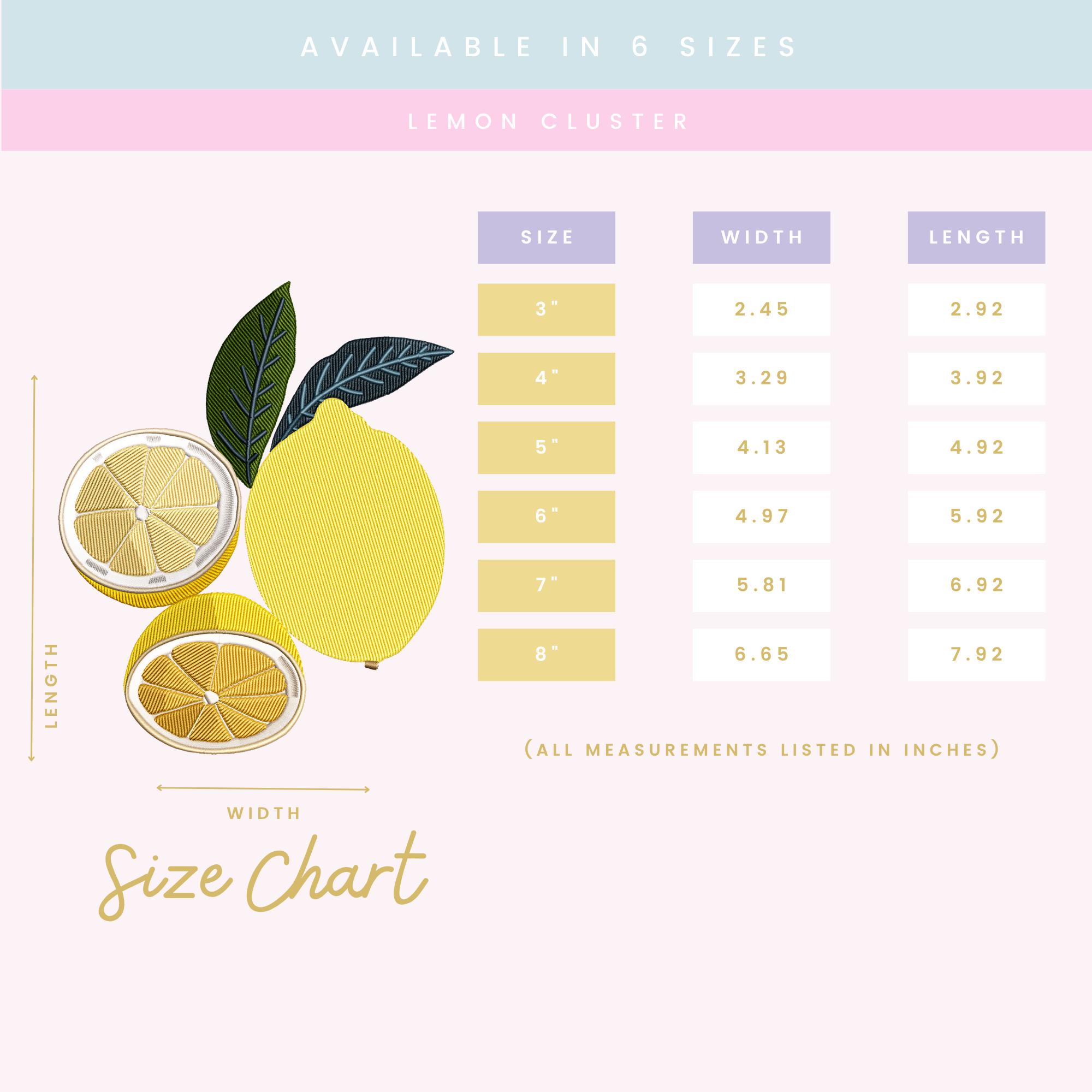 Add a fresh, bright touch to your projects with this Lemon Cluster embroidery design, featuring whole lemons, slices, and leafy accents in a clean, modern style.