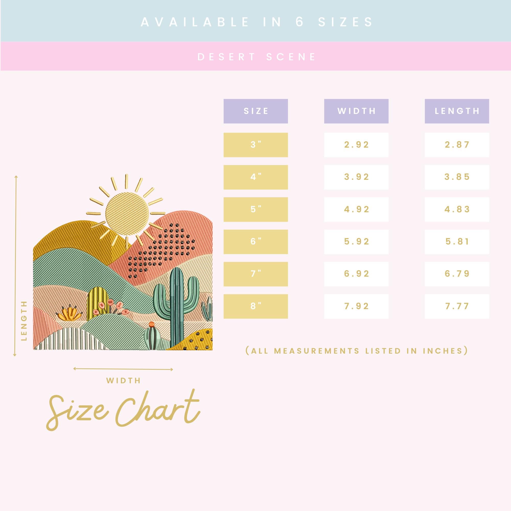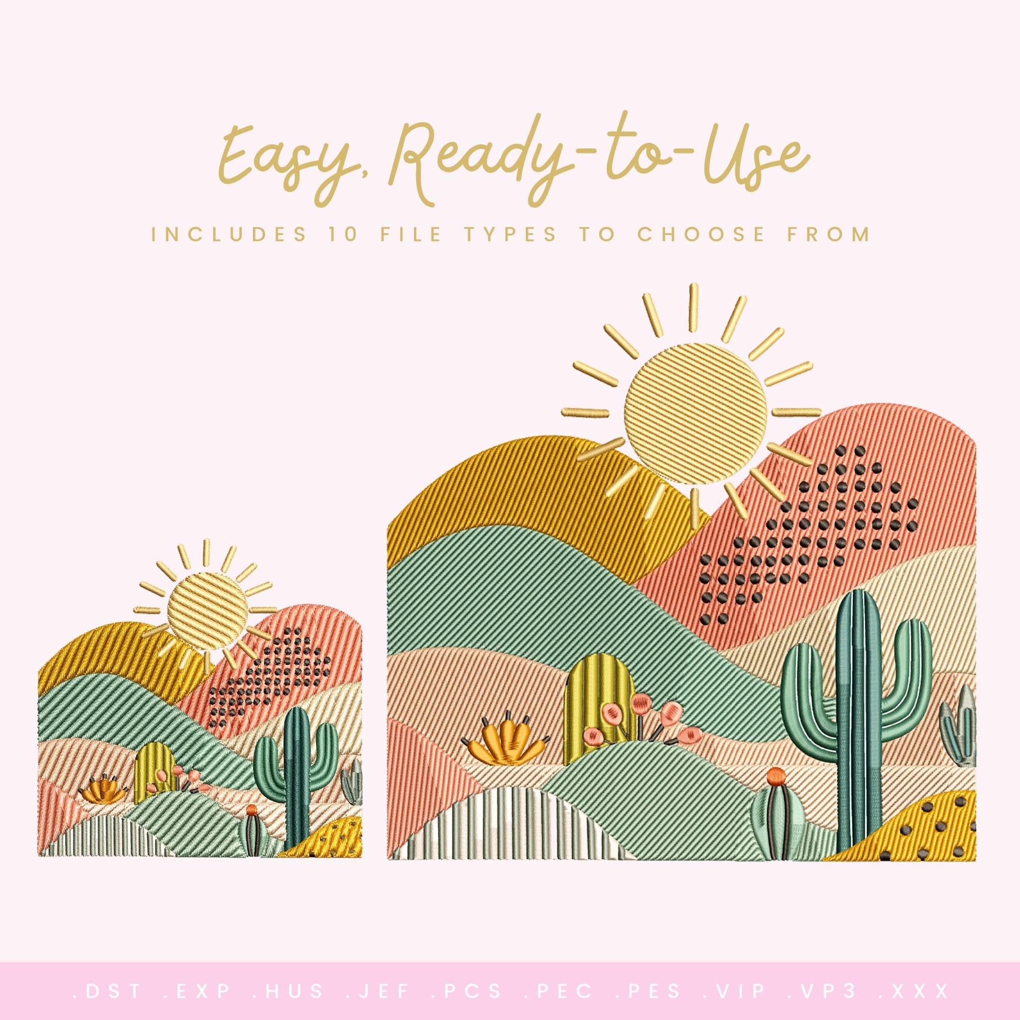 Add a modern, artistic touch to your embroidery projects with this Desert Scene design. Featuring layered rolling hills, a radiant sun, cactus elements, and textured stitch patterns, this design brings a warm boho and western-inspired aesthetic to your creations.