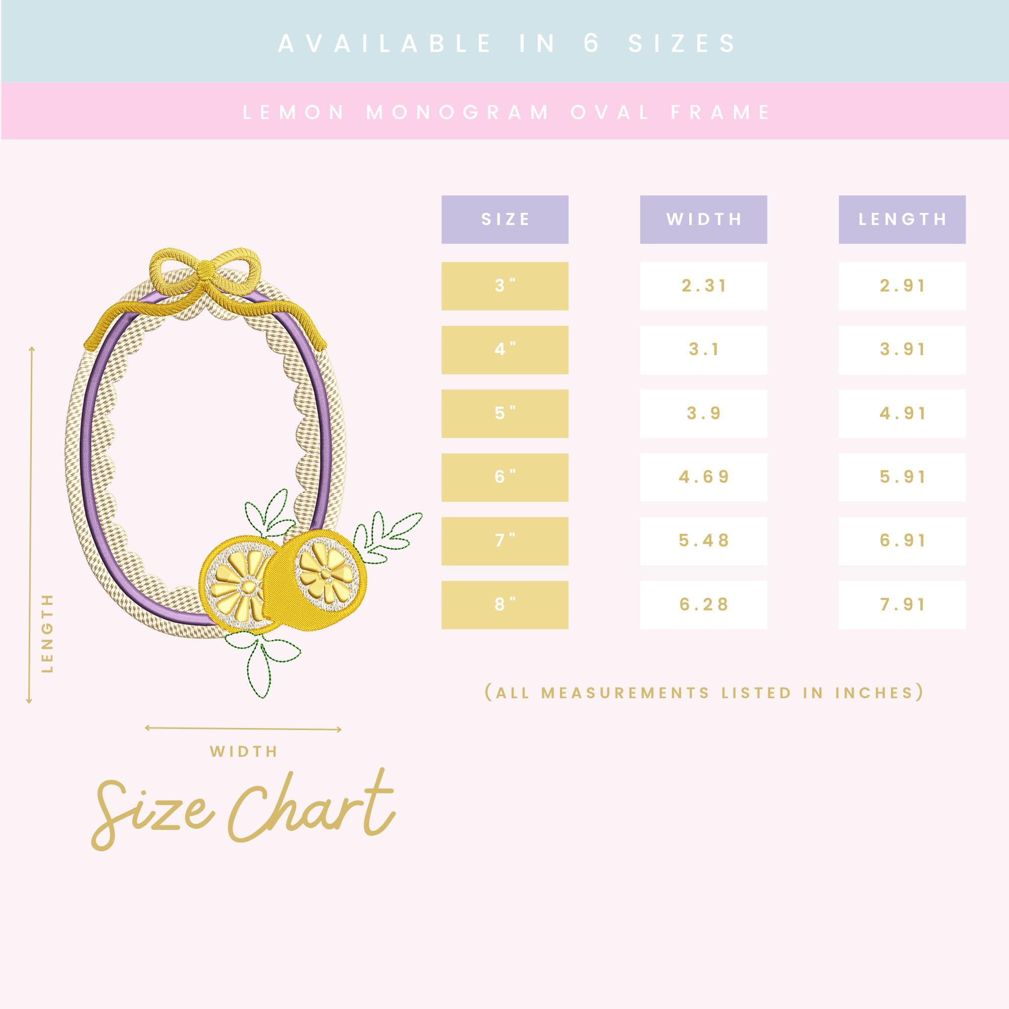 Add a fresh and cheerful touch to your embroidery projects with this Lemon Monogram Oval Frame design. Featuring a scalloped oval frame with a soft inner border, topped with a delicate bow and accented by bright lemon slices and greenery, this design is perfect for custom names, monograms, and personalized gifts.